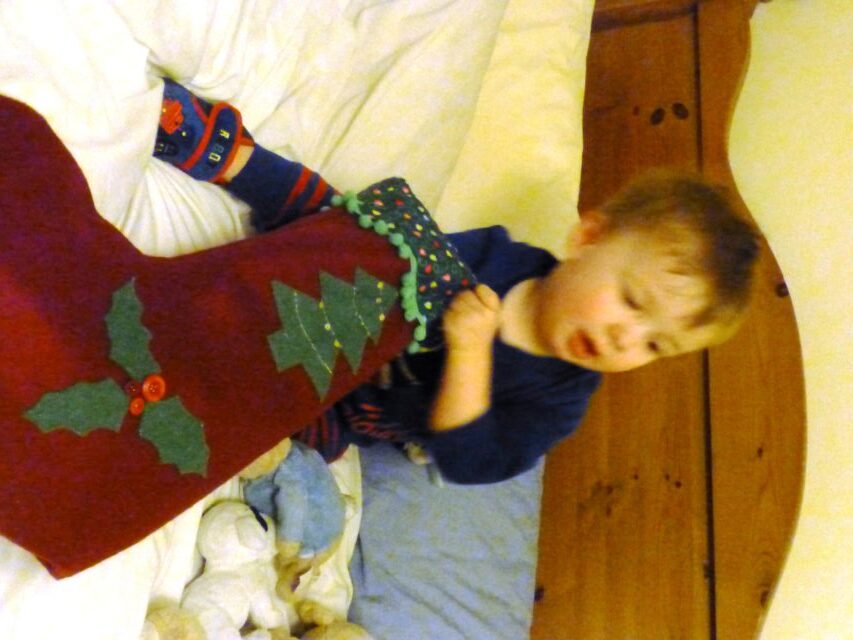 I did a stocking for him for the first time, although we didn’t say anything about Father Christmas visiting in case he got scared. So it was a total surprise for him to have a stocking the next morning. This is bound to be the last year he lies in – OH came in after feeding at 6.45ish, and N was still asleep. He woke at 7.15 so then came into bed with me until his dad came in again to do the whole stocking thing.