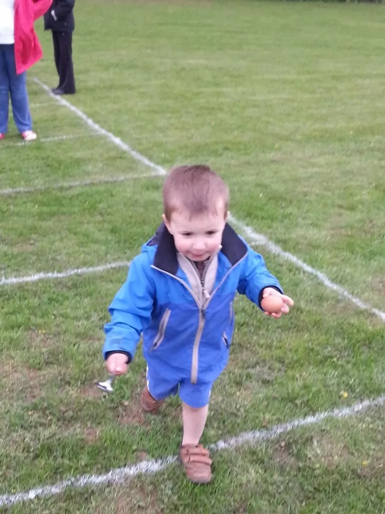I don’t think he quite got the hand of the egg and spoon race. He was more concerned about where his friend was, and then spent most of the time running to feed the nursery shetland ponies, or running up and down the field. No wonder he was exhausted by the time he got home.