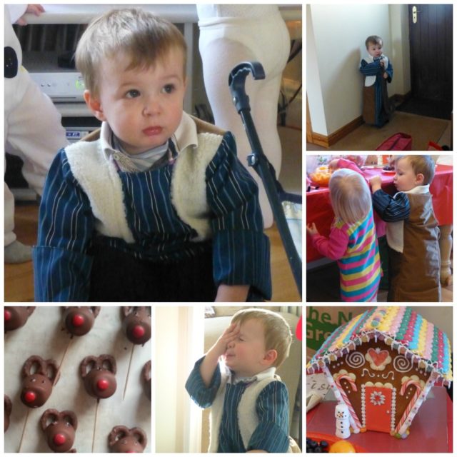 Costumes were decided upon (thank you supermarkets and their offers on clothing!); I’d let him choose between king and shepherd outfit. Think he wanted the shepherd one for the crook (although he used it mainly as a walking stick), and to be like Uncle ‘Renry’ looking after sheep. Again we had a great mix of costumes, ranging from a star, ‘miss christmas’, right through to an ingenious ‘gift bag’ and hat snowman costume.