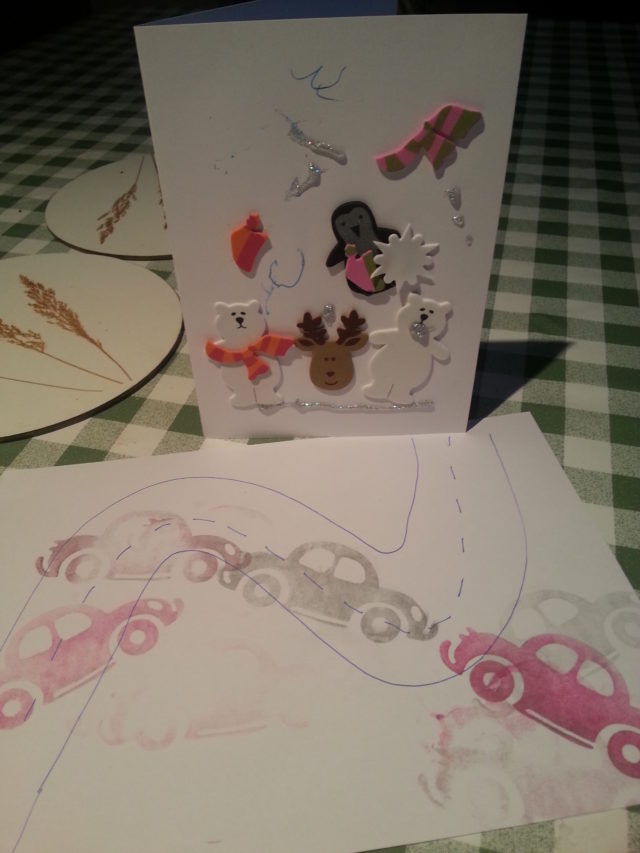 2. Stamping (thankfully I have kept hold of some of my card making supplies so found this car foam stamp, plus some ink pads, I drew the background road, then N stamped…he liked the ‘darr’ stamp alot)