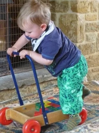It’s a really versatile toy: as well as being a walker, it’s been a seat, a ‘buggy’ pusharound, a leaning post, a base for building towers, toy storage, wheel turning experimenting fun, and obviously the blocks are great for banging, sorting, building towers and putting in and out of larger containers. He still uses it as a type of walker/pushalong, but he does also have a tendency to stand on the blocks in the trolley, hold the bar and (with us holding our breath, waiting for a tumble that usually, thankfully, is rare) try and move it with momentum.